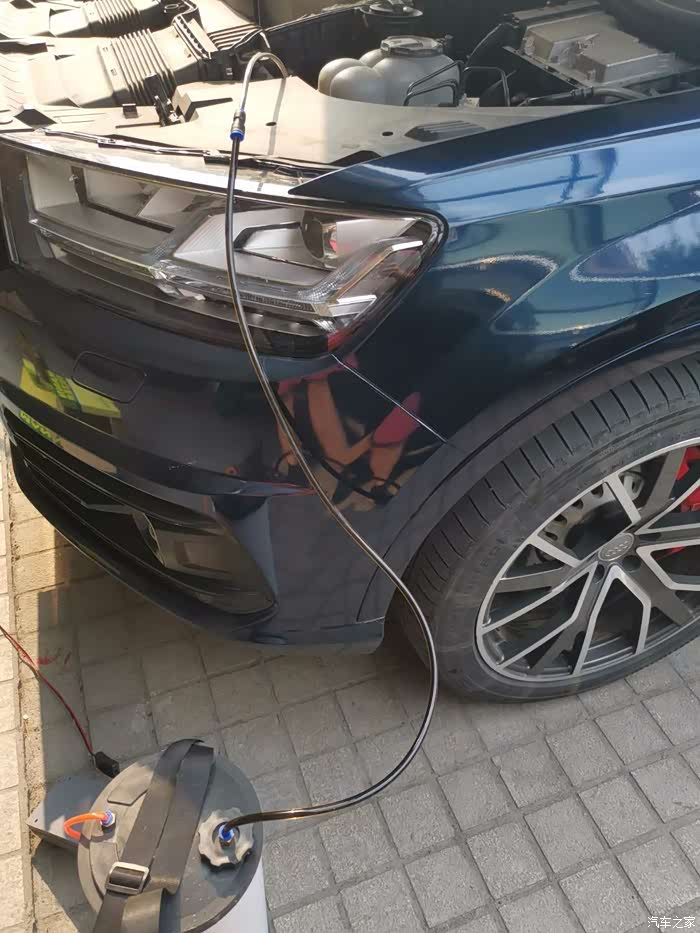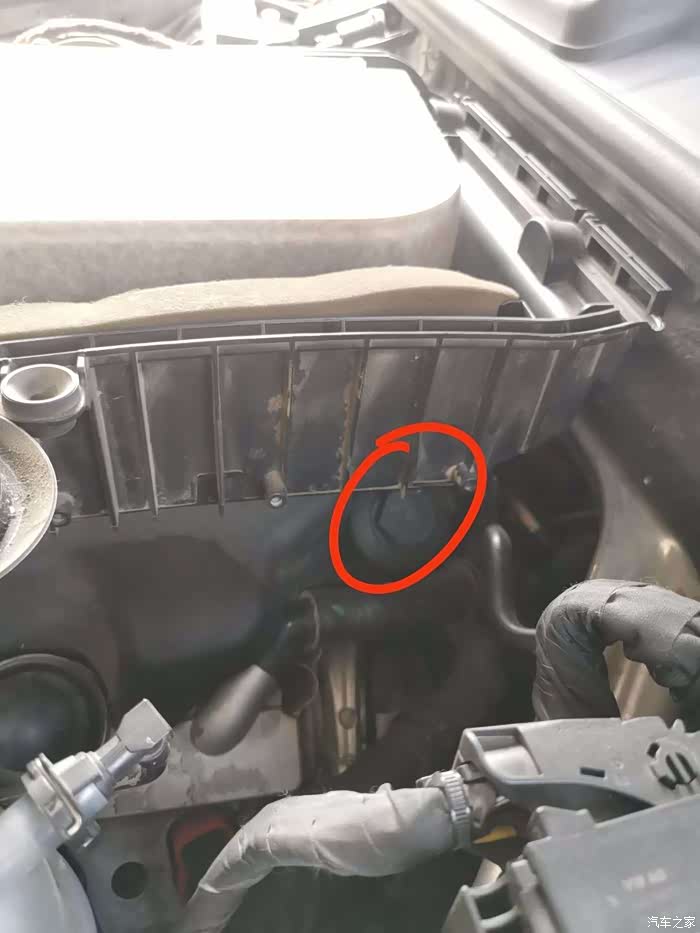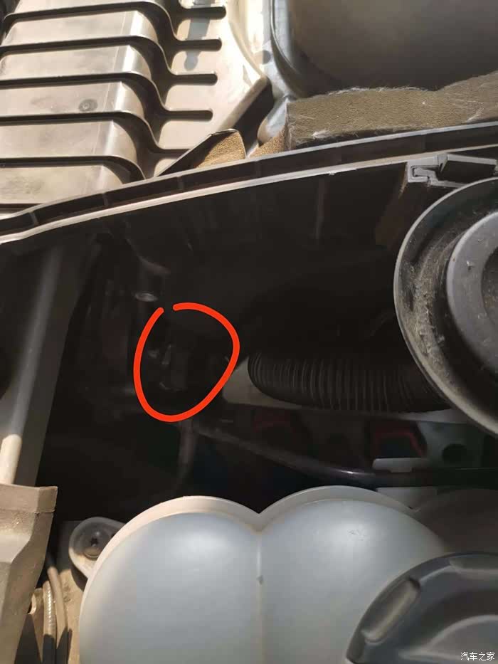 发动机靠近水箱那一边,里面有个小卡扣,位置如图所示,往上一掰就能拿下来 ,这位置原来是机油尺,Q7是电子油尺取消了机油尺,但是口子还是留着了,抽机油就可以从这个口子去抽,抽油切记不能冷车抽,我一般去跑到70~80℃,