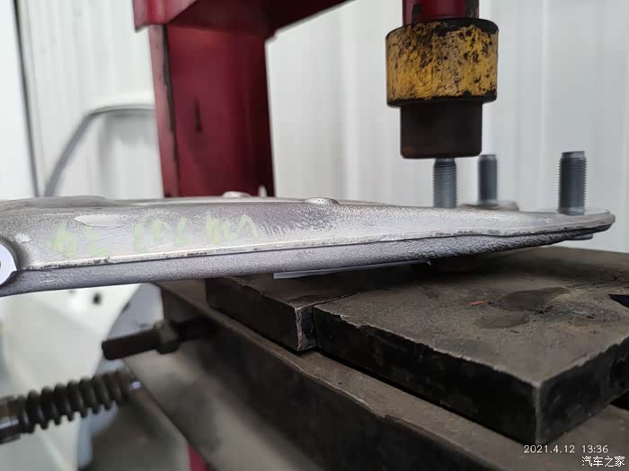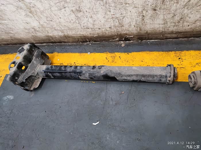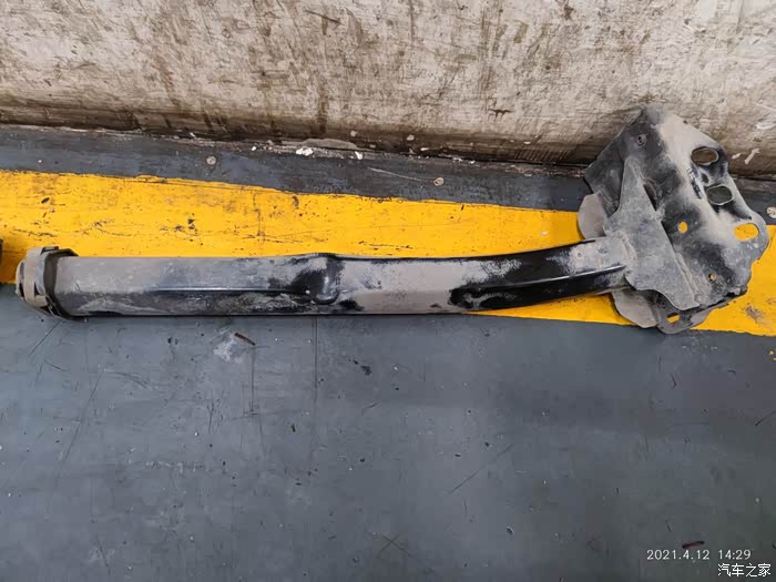 拆下来的下纵臂,也就是行人保护防撞梁的溃缩柱,薄薄的一个不知道是钢还是铁筒