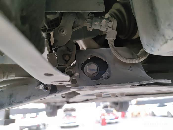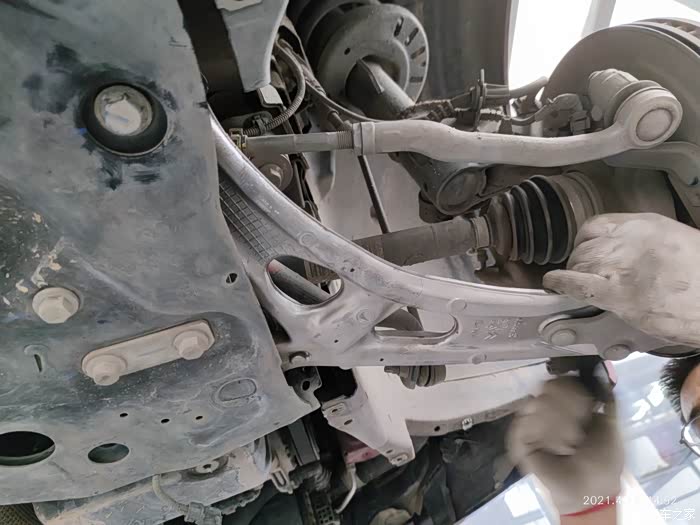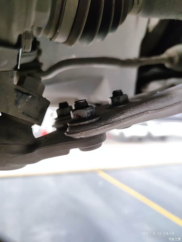 到手后好多天没有时间安装,心里一直有个事挂念,这天早晨下了一场雨,室外搬砖比较泥泞,这不直接休班,等到接近中午到了ssss店更换一下,顶起车子发现车子球头自身是带着铆钉螺栓,这个铝合金三角臂上的螺丝就多余了,维修师傅说不敢给砸,怕给砸变形。我想这个哪能砸呀,得用千斤顶冲压,得还是我来吧!