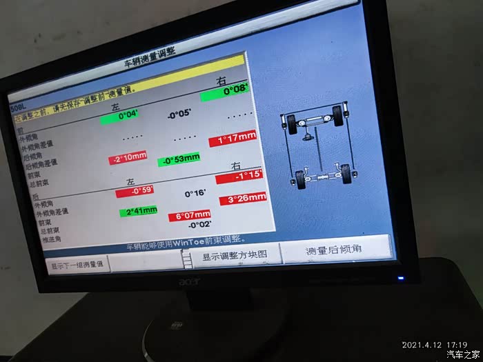 看看这数据,谁说换减震器和下支臂不需要做四轮定位的站出来挨打,最后左右前束调整为-1.06左右结束。