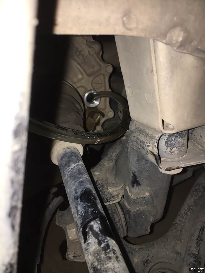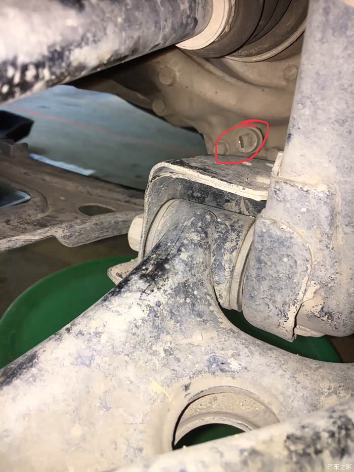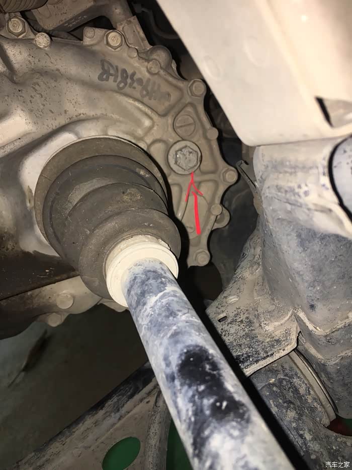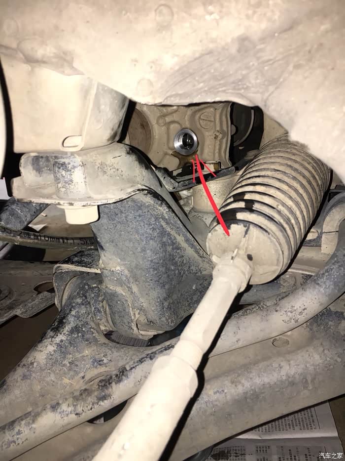 顶起左前轮并拆下来方便观察,事实上拧加油、放油螺丝都是躺在车底下完成操作的,箭头所示就是放油螺丝用17套筒招呼它。