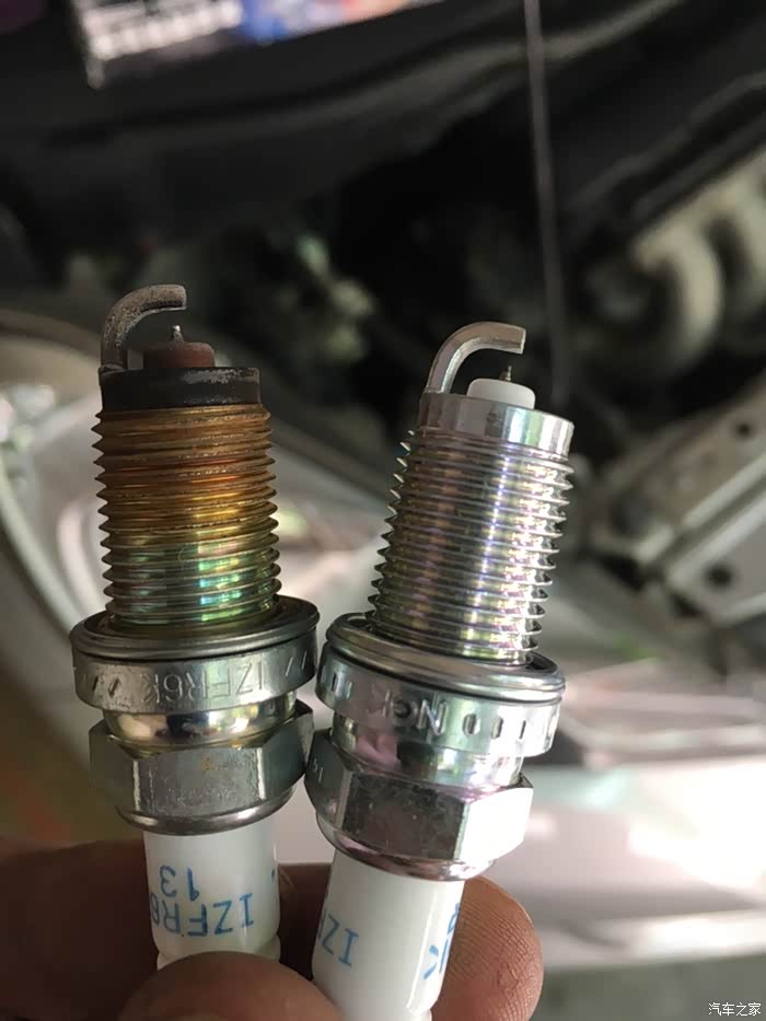 新旧对比,型号是NGK的lZFR6K13铱铂金火花塞。看到这样的成色决定继续聘用,不过15万公里不批准退休。这样写可能有人喷,爱喷就喷,我的车油耗常年在6以下而且动力没衰减换它干啥。不换就装回去