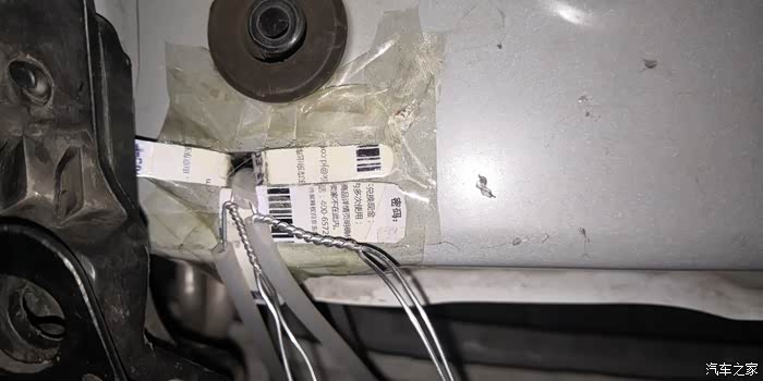 拉铁丝上来,铁丝是从防撞梁前面穿上来的,固定到水箱框架的这两个位置。这两个位置要用塑料卡片(我用的京东礼品卡,废弃银行卡都可以)缠上透明胶固定在这里,以免铁丝拉破水箱框架的金属漆面导致生锈,铁丝也要穿这种硅胶管,以免铁丝在里面磨坏防撞梁漆面也会生锈。