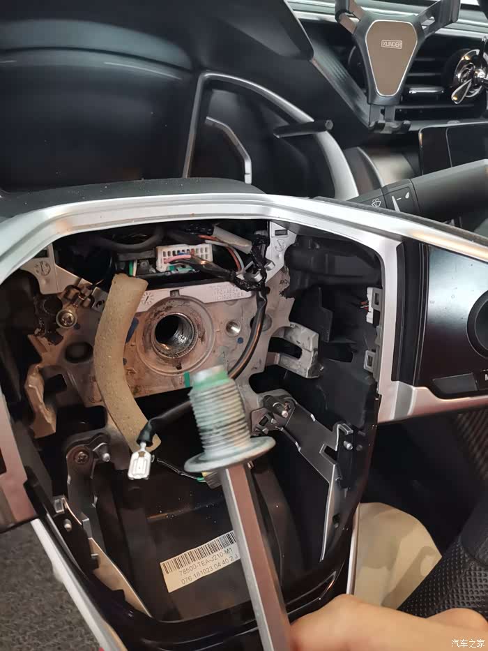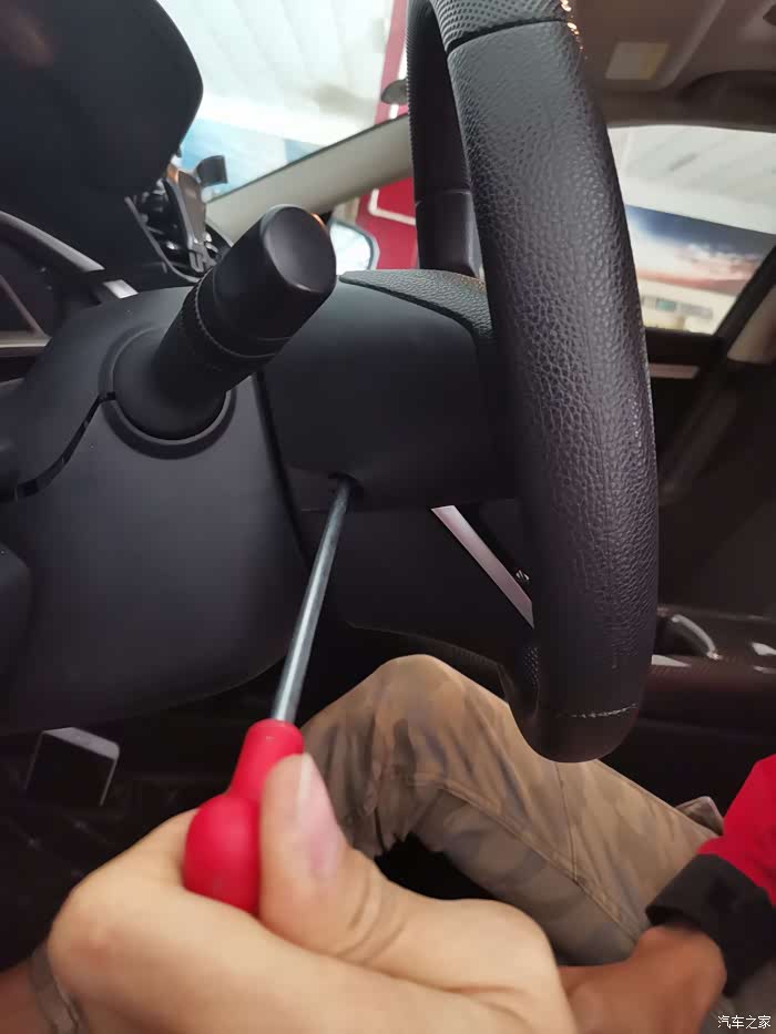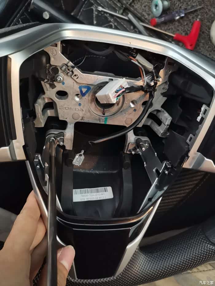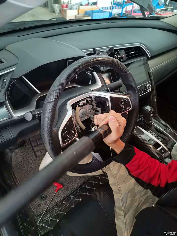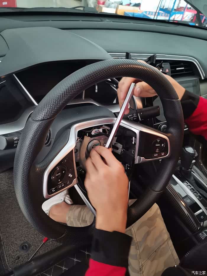 现在用10mm内六角+加力杆拧松方向盘中间螺丝(没开钥匙方向盘是会自锁住的,所以直接拧中间螺丝)