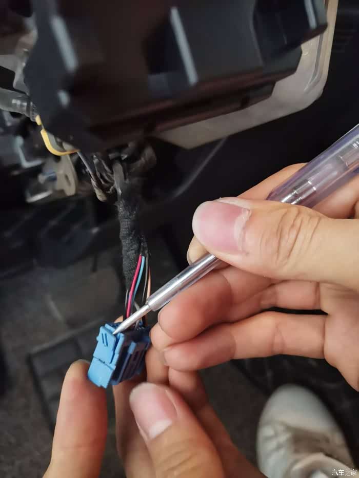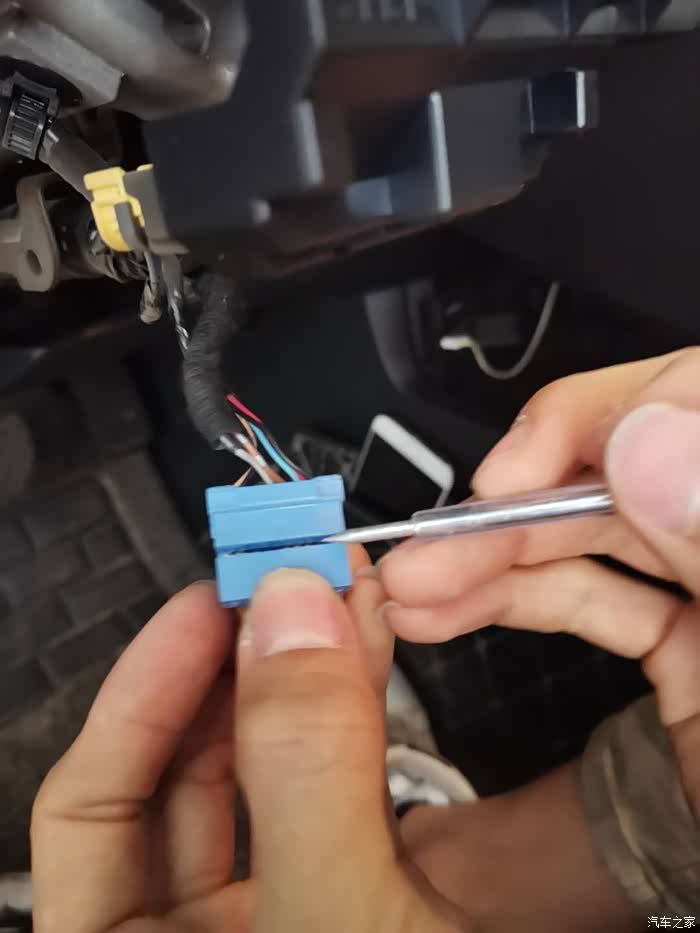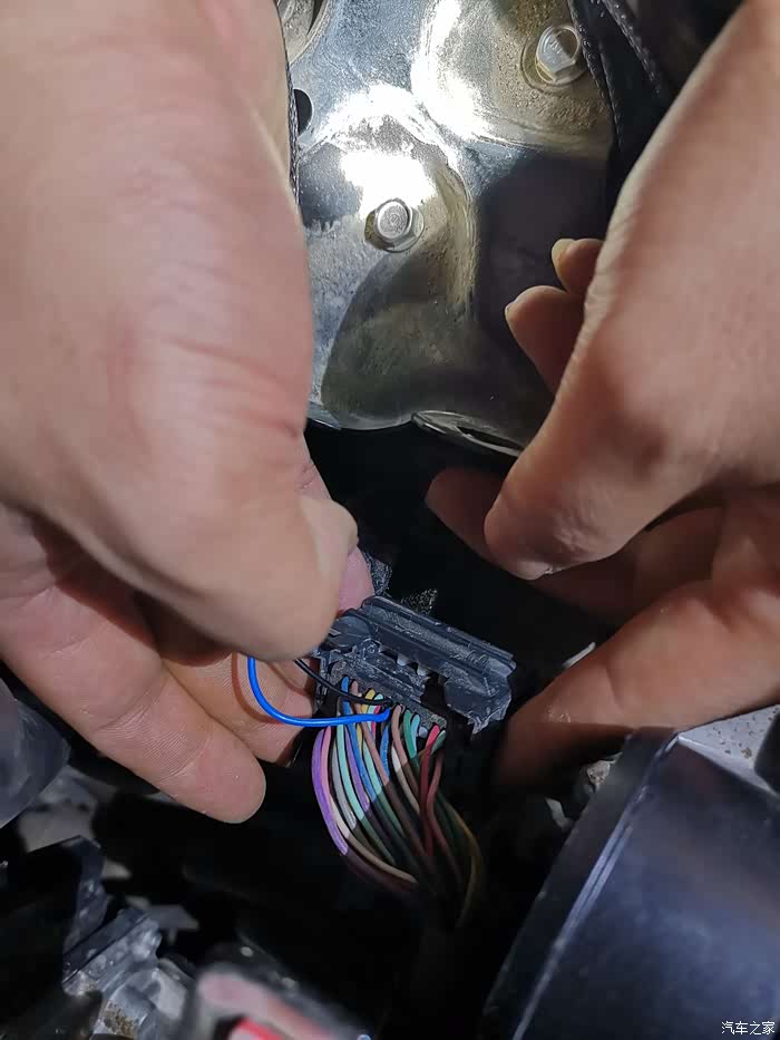 如图蓝色黑色,检查端子是否到位,注意方向,检查完毕复原插头