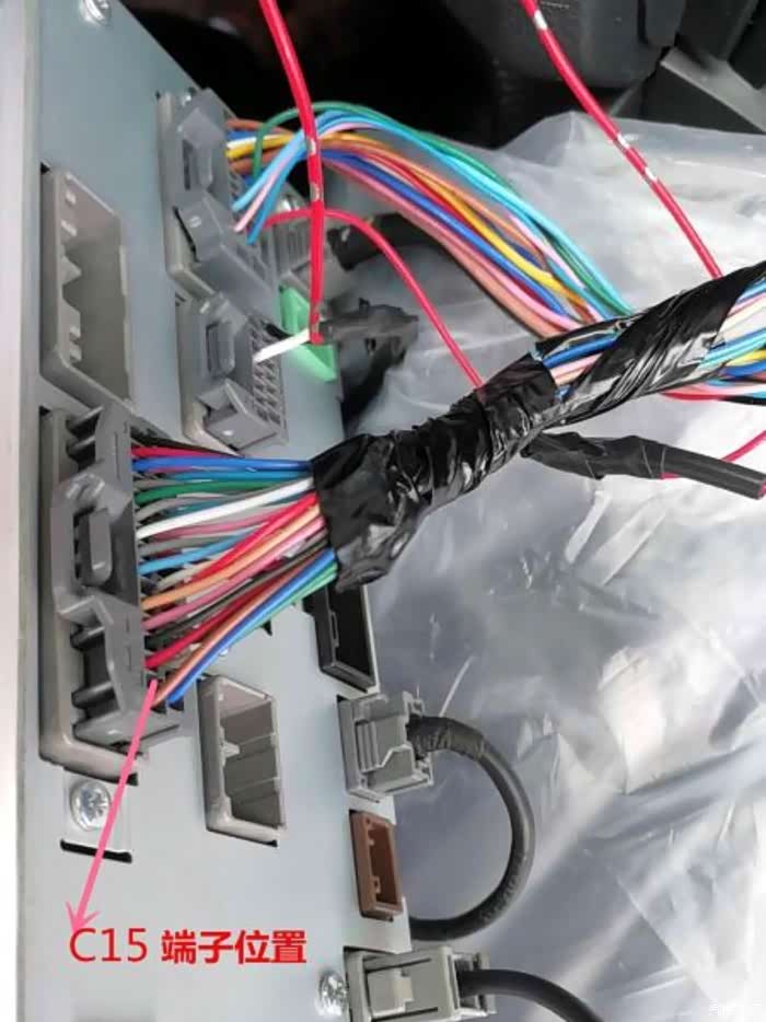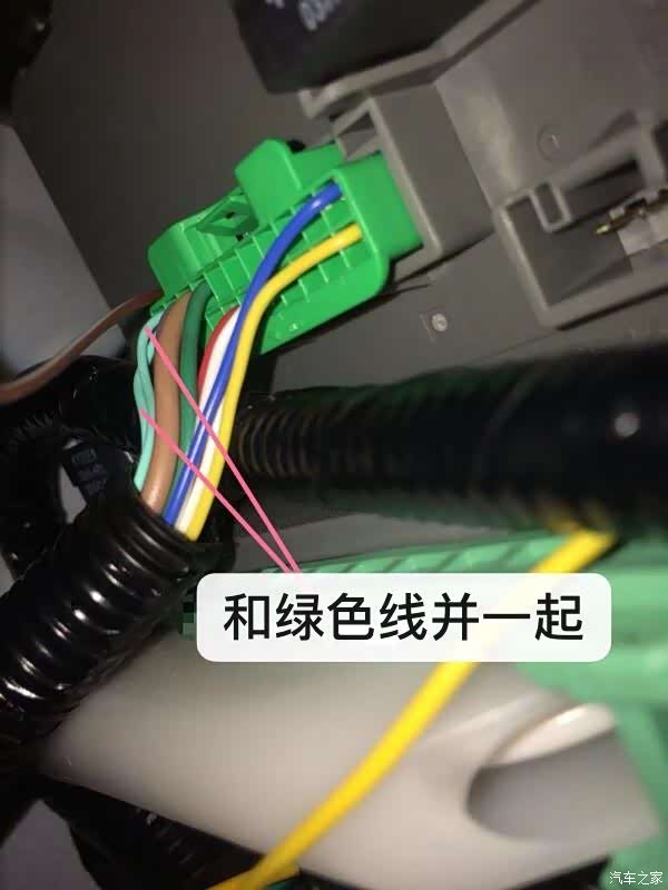 倒车线另一端接到驾驶位左侧下面的绿色插头,把头伸进去就能够看得见,跟倒车灯的线并在一起,破线或者把端子跳出来并线都行。