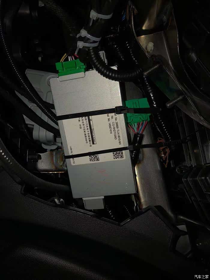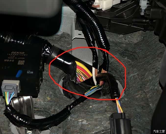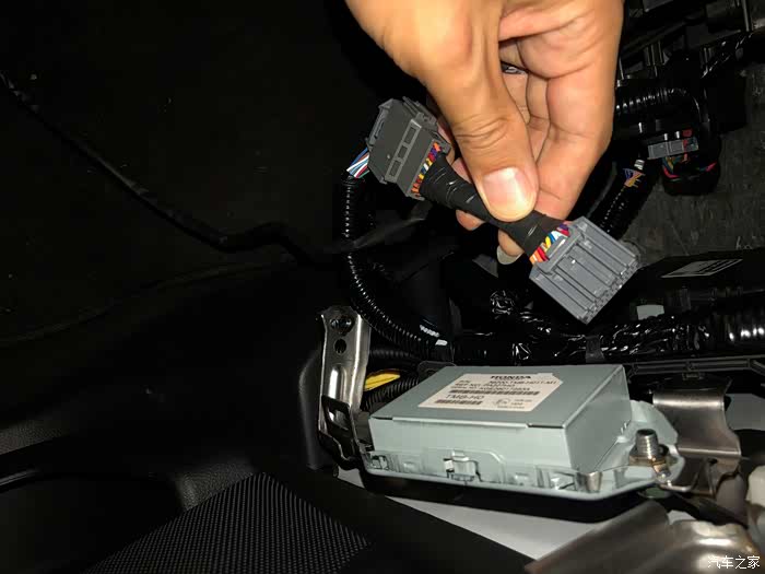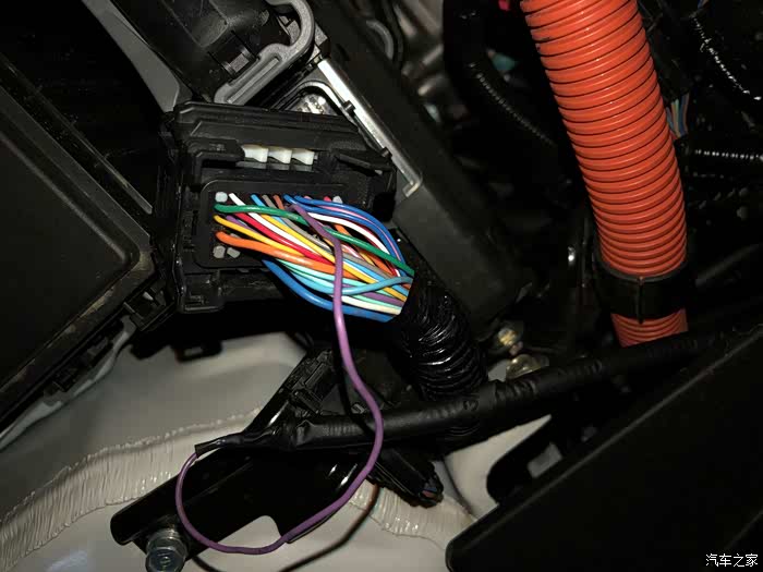 后来又做了一条随速音量线,一端从驾驶位下面靠里边的大线孔的胶圈,撬开一点点,把线穿过来,接在ECU的这个孔上,接这个线时要注意先断车上电瓶的负极才可以操作。