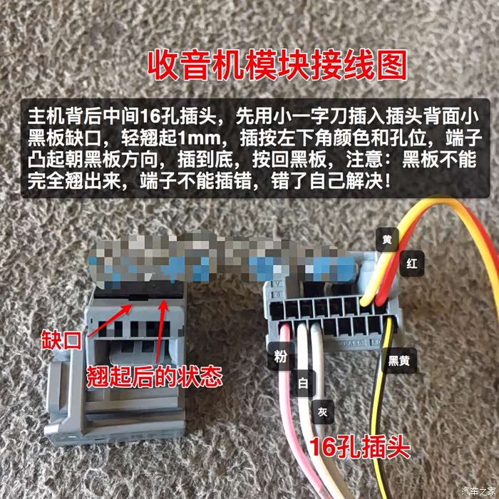 解决到消噪模块的3根线,白色端子插到中控倒车插头10号孔,电源插头旁边有个16孔的插头,黄色插5号,蓝色插13号