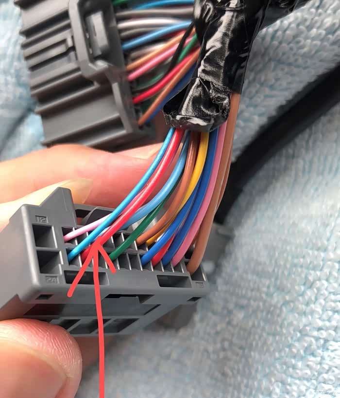 另一端接在中控20针插头的这个孔就完成随速音量线的安装了。