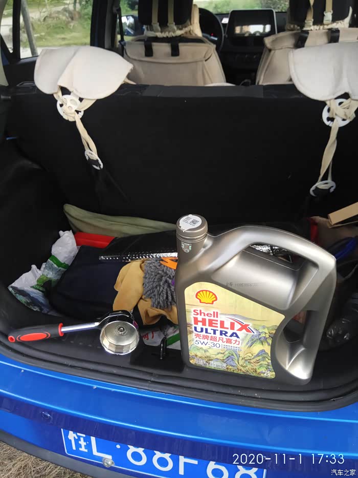 完事了,把剩余的机油和工具放进后备箱,以备万一。万一半路漏油了可以补充机油,也能紧固。