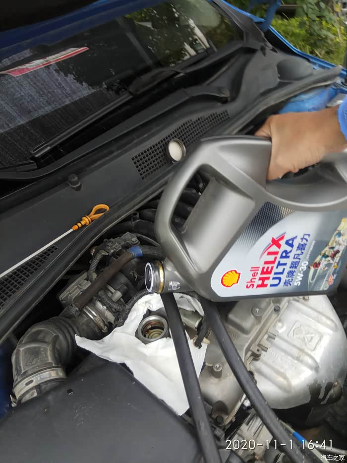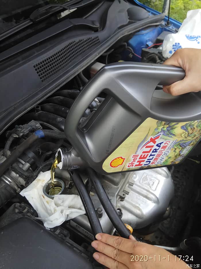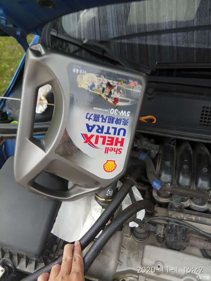 打开上次保养没加完的机油,是10个月前的。一直封闭保存,还在保质期内,准新机油。