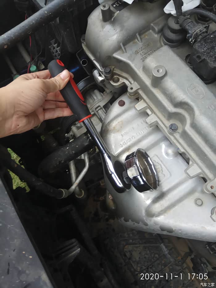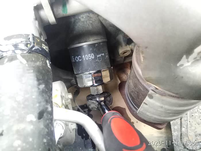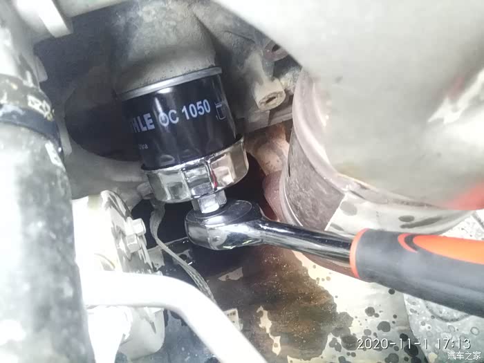 机油滤芯套筒和快速扳手上场。准备拆旧的机油滤芯。