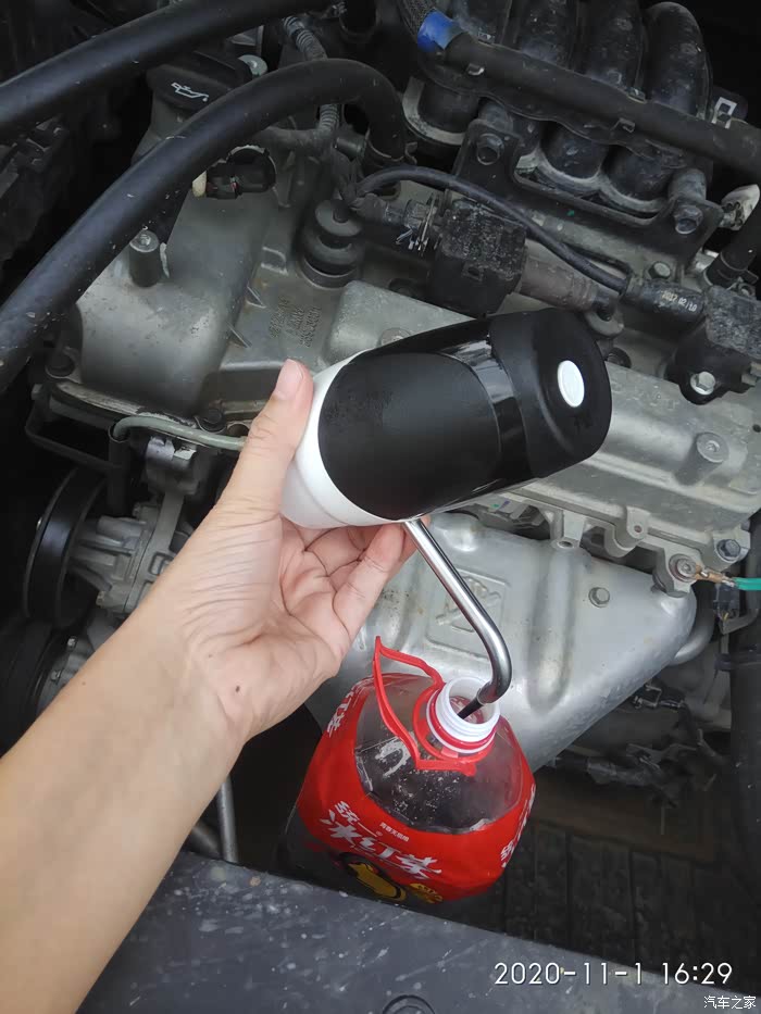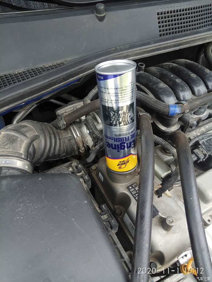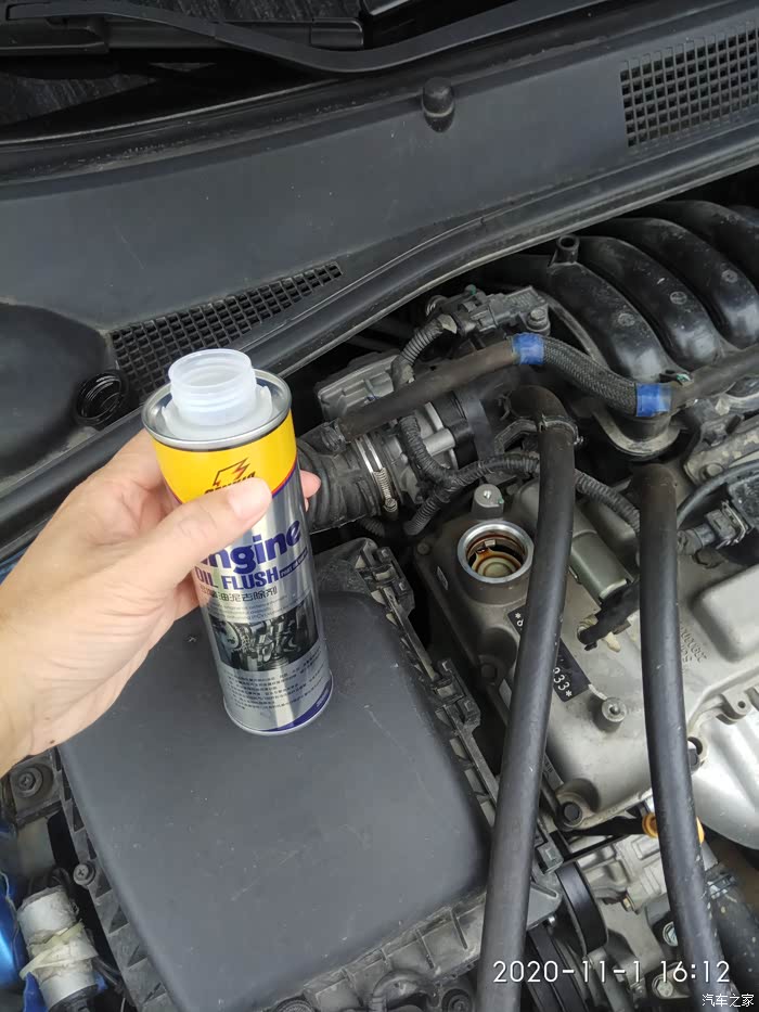 首先加入“发动机油泥清洗剂”,不是每次都用加,4万公里加一次就得了。