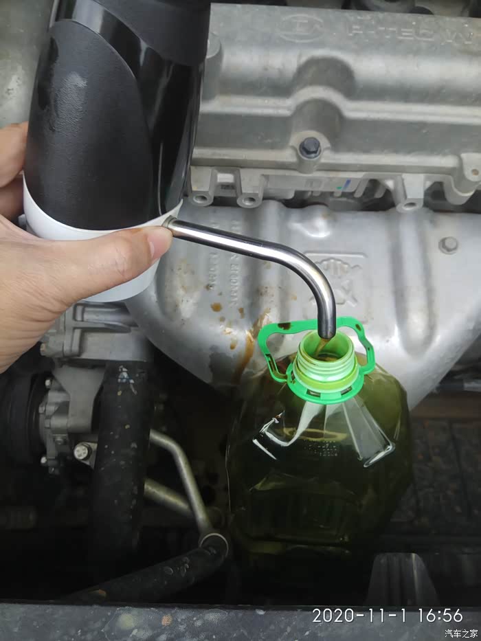 继续抽机油,这次抽出的是新机油和旧机油的混合机油,可以看到颜色比较透明的,不黑。