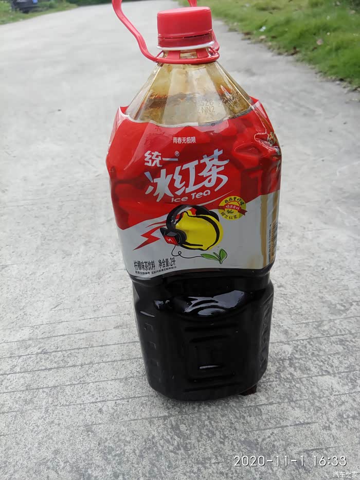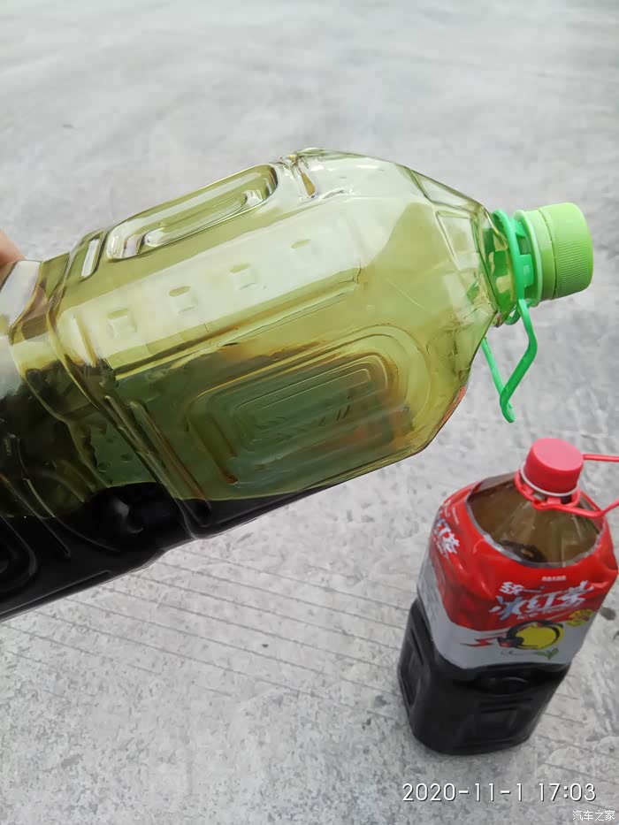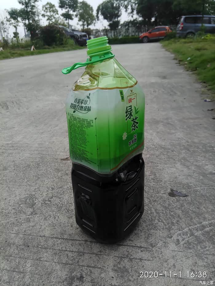 撕掉绿茶标签观察,两瓶一共抽出了大概3.2升机油。