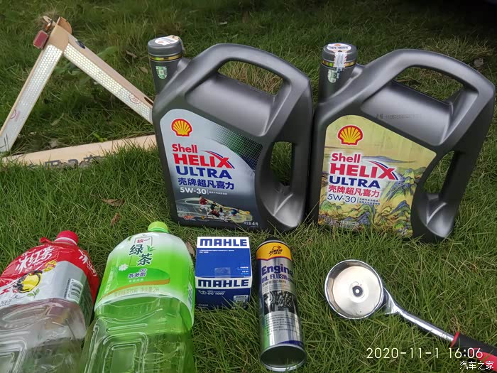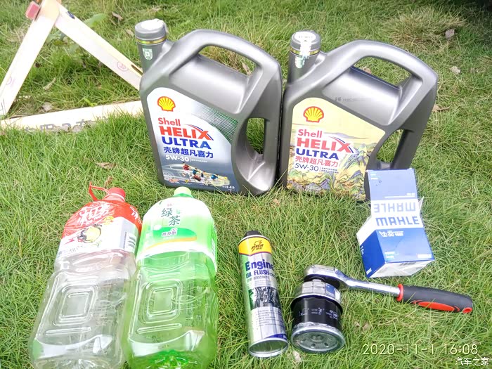左边(灰色贴纸)的是上次自己保养剩下的机油,大概700毫升,称为准新机油。