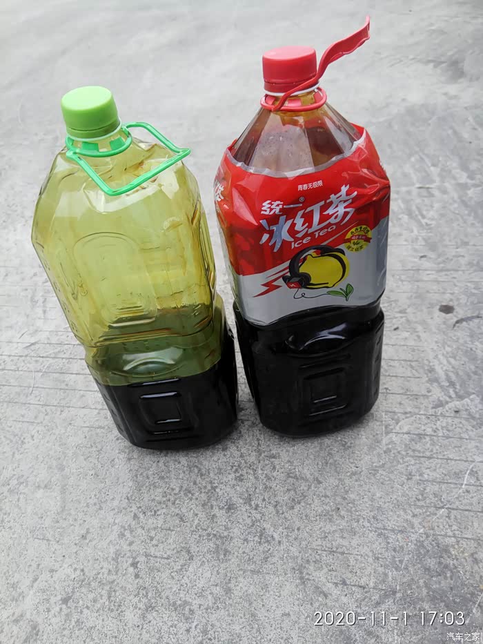 绿茶瓶是新旧机油混合,红茶是旧机油。