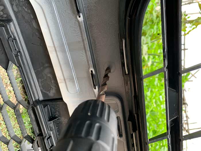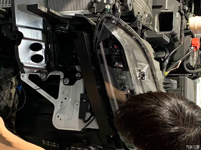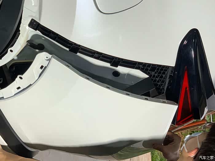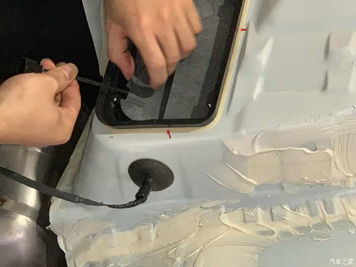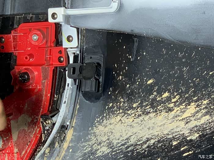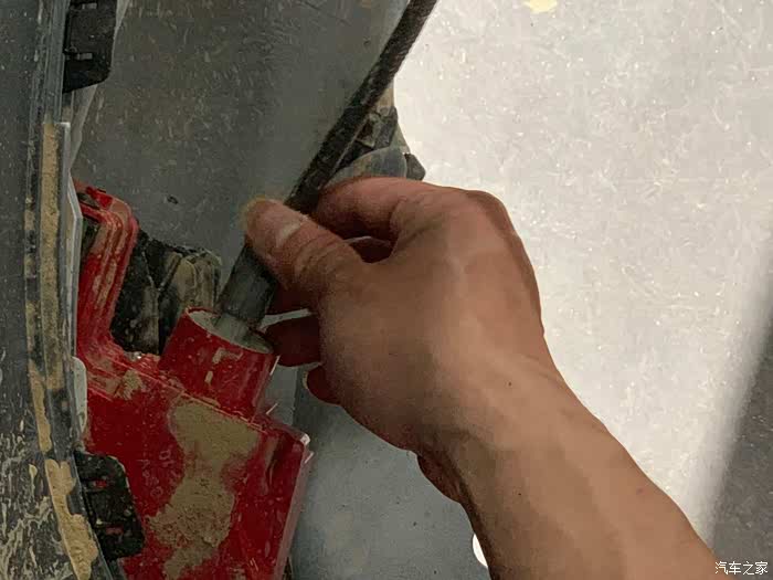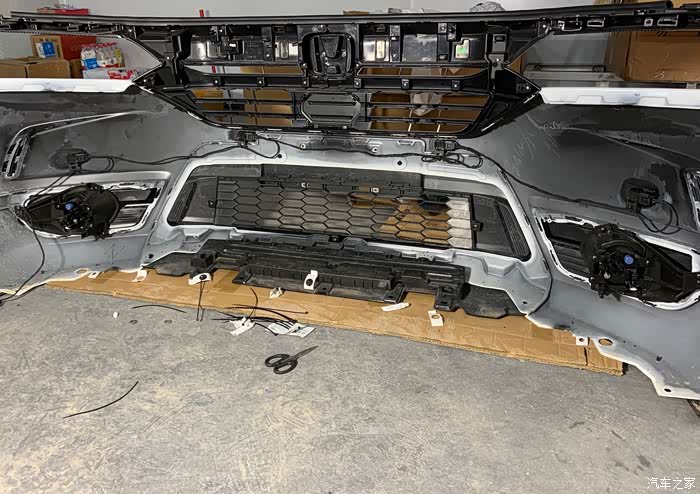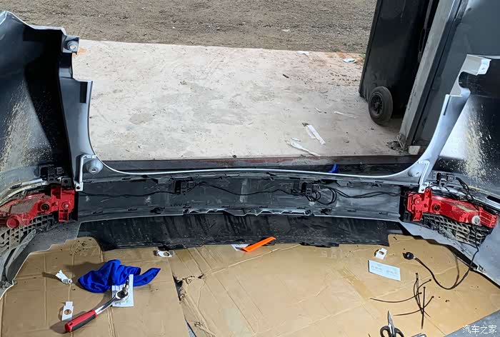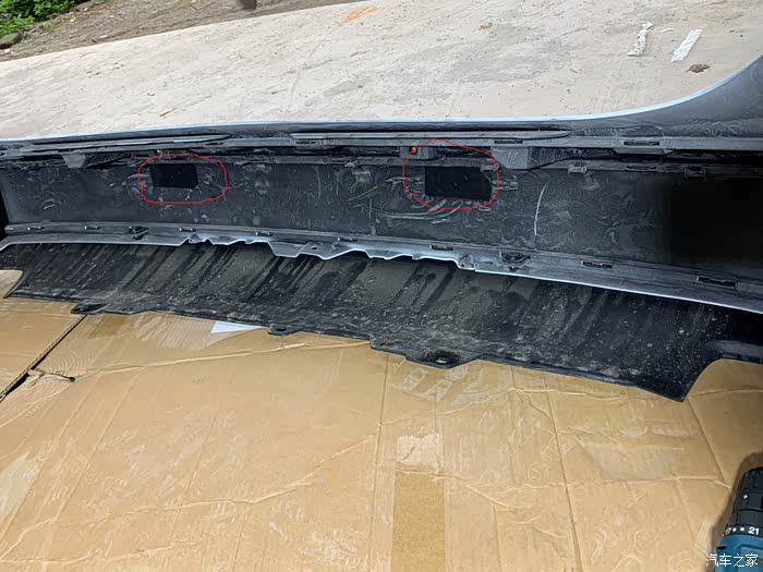 接下来看这个前杠后面,找到四个如图有个框的位,这是雷达的位置,用工具在圆圈开孔