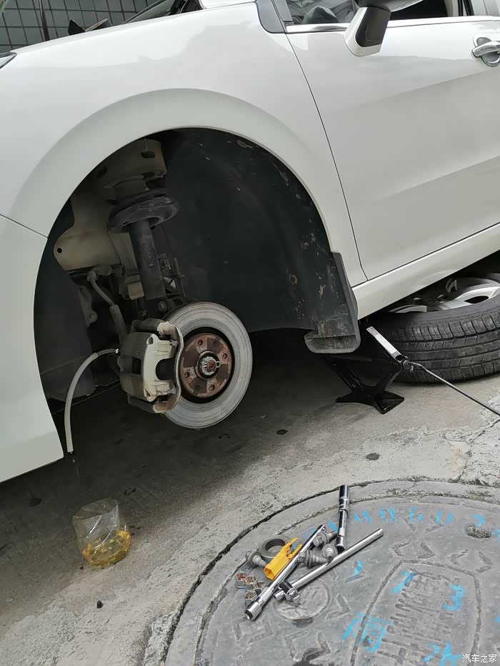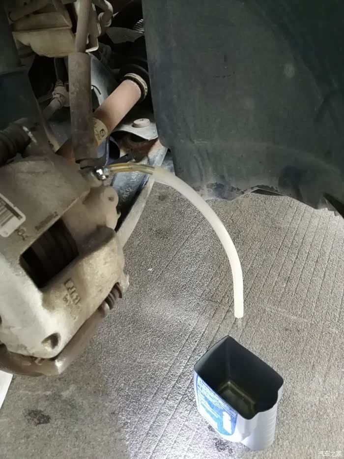 把油连接好了,准备拆轮子,是从右后到左后到右前到左前,本身想用那个泵抽的,结果松开刹车分泵的放油螺丝,螺丝边上的缝隙进空气抽的慢,干脆留开让它滴算了。