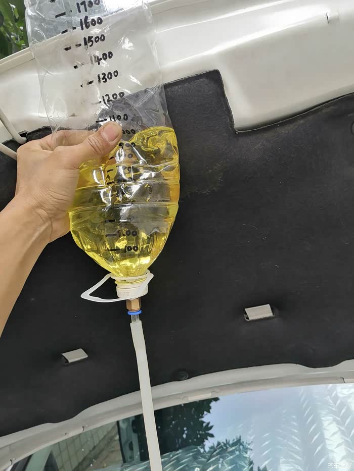 底下的油壶注满之后装回小油壶把油倒满,再把自己改装的盖子拧上连接,然后把新的刹车油装在瓶子里面挂起来,把2升矿泉水瓶子用刀片把挂起来的瓶子底部割一个孔,要不然油不好下去会把瓶子会吸扁了。