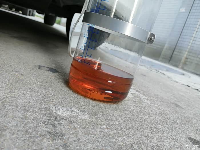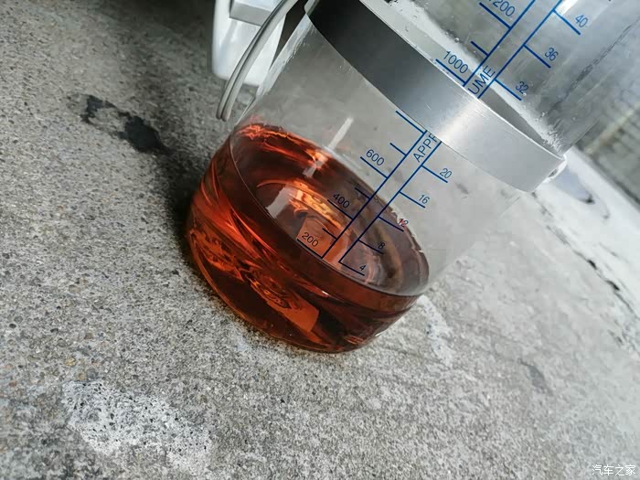 这是抽出来的旧油,从底下数起来第1条白线的油量是小油壶的,第1条白线以上的到200毫升的位置是大油壶的油量,总之小油壶和大油壶内部的油量就是200毫升。