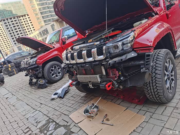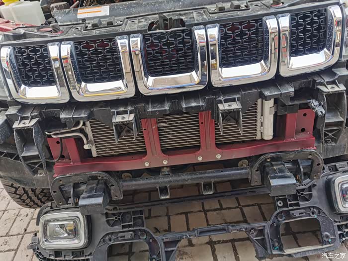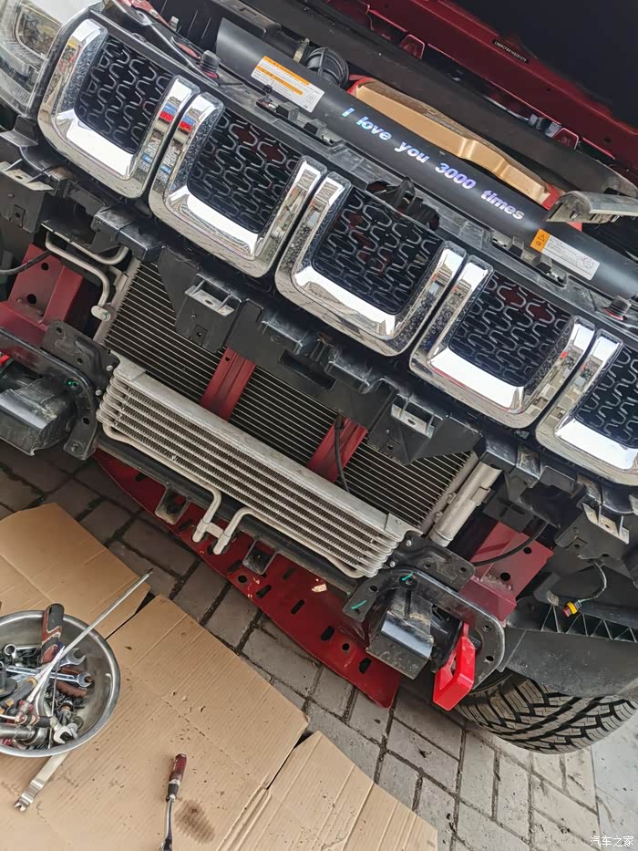 2.0T比2.3T多个变速箱散热器,2.0T是采埃孚波箱,2.3T是爱信波箱,散热器被装在,铁杠下边的红网后面,固定比较麻烦,扎带固定,泡沫减震,玻璃胶加强,这个位置散热应该比原来好,但是需要掰弯散热器管路,管路是铝的,比较软,没啥问题。