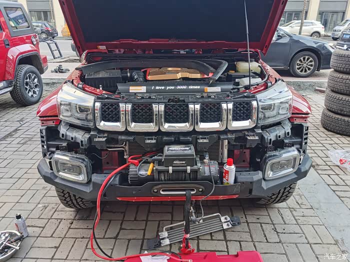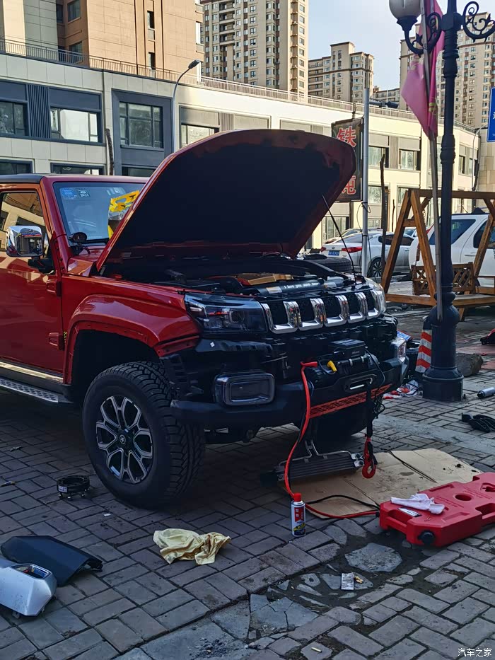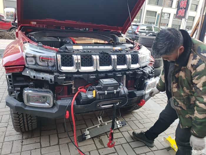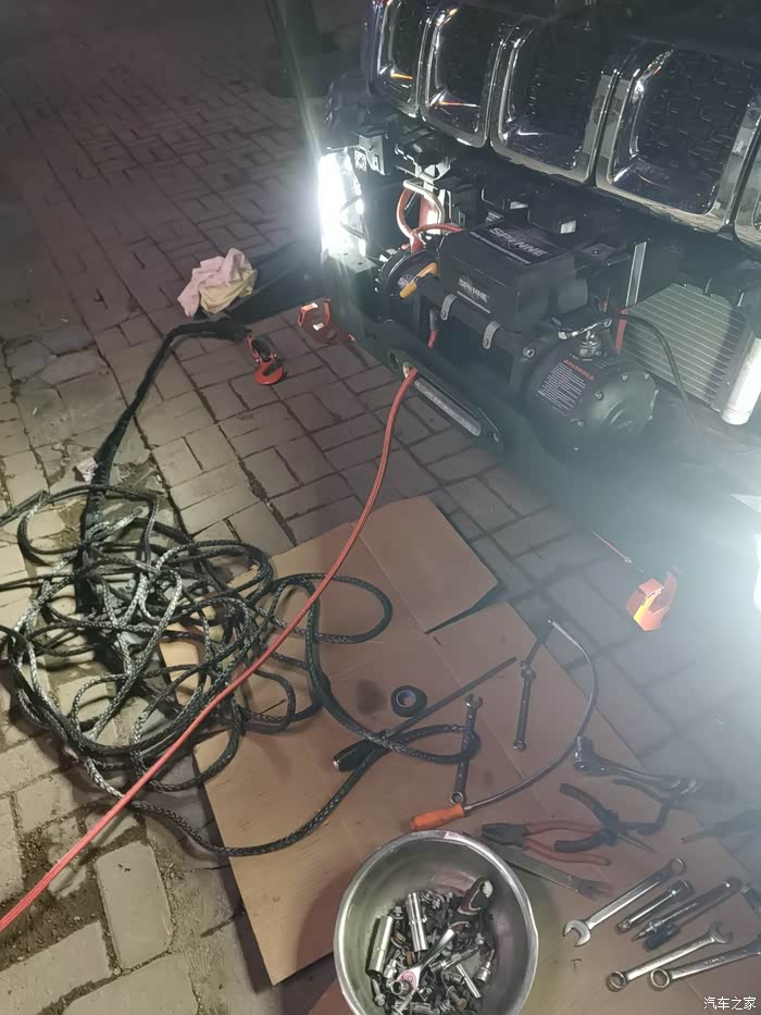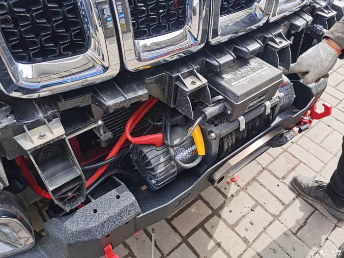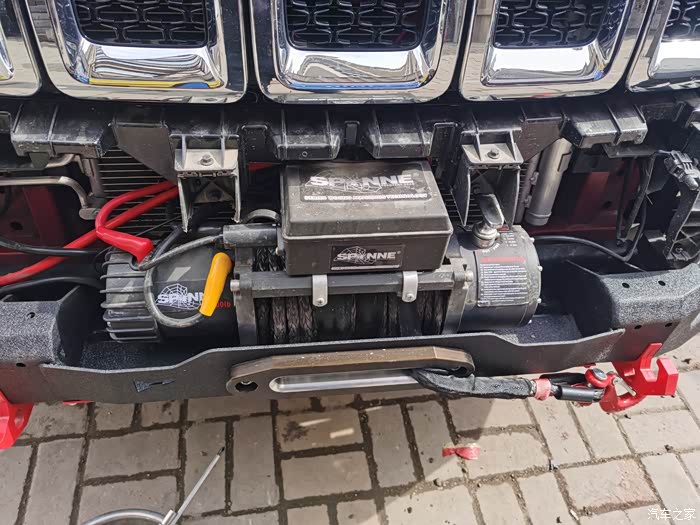 这是蜘蛛12000邦绞盘,重量还行,前杠比较轻,半杠中的半杠,因为看着轻才选的。因为朋友的车是原厂弹簧,前踏板高度压到41Cm,我是花火1英寸强化,装完了杠和绞盘44CM,支撑比原车好很多,这次估计出去玩,不用那么害怕了,上次掉泥坑差点没上来