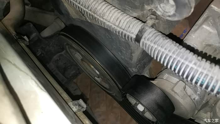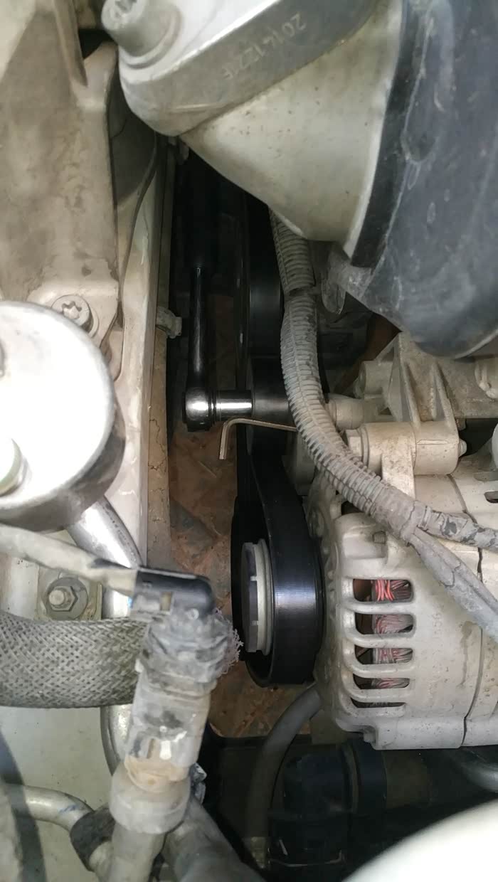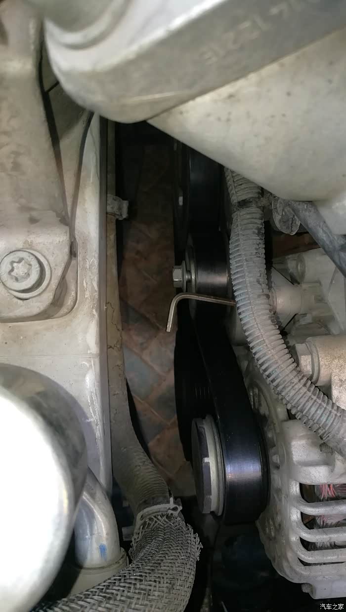 换上新涨紧轮后,在紧螺杆之前,记得检查一下楔形皮带和各个楔形轮是否咬合好,如果错开一个槽,只有拆下涨紧轮重新对准,因为卡住涨紧轮皮带松驰下来的余地太小不足以调整,我就这样返工过。
