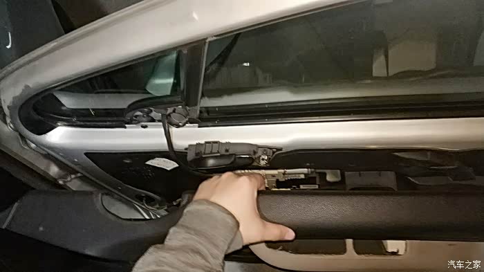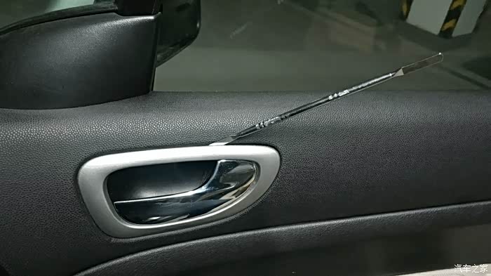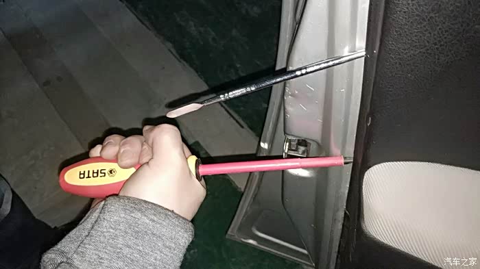 我从右前门开始拆,先拆螺丝。前边两个门都是4个螺丝。然后拆扶手盒。翘就行。