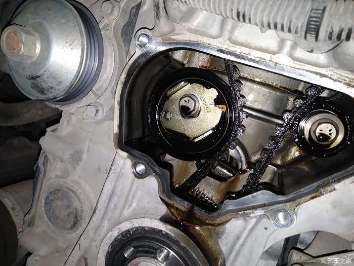 拆开了侧端盖看到了涨紧轮和皮带还有曲轴油封(黑色大圈,没坏,但也要换)