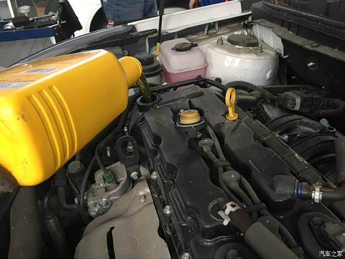 机油添加完,维修师傅对各种油液进行检查添加