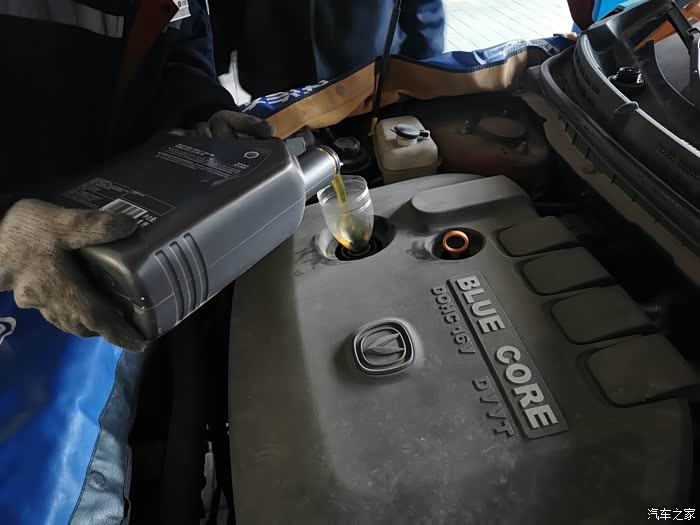 黄澄澄透亮的机油加入,本次保养的主要进程已经开始收尾。