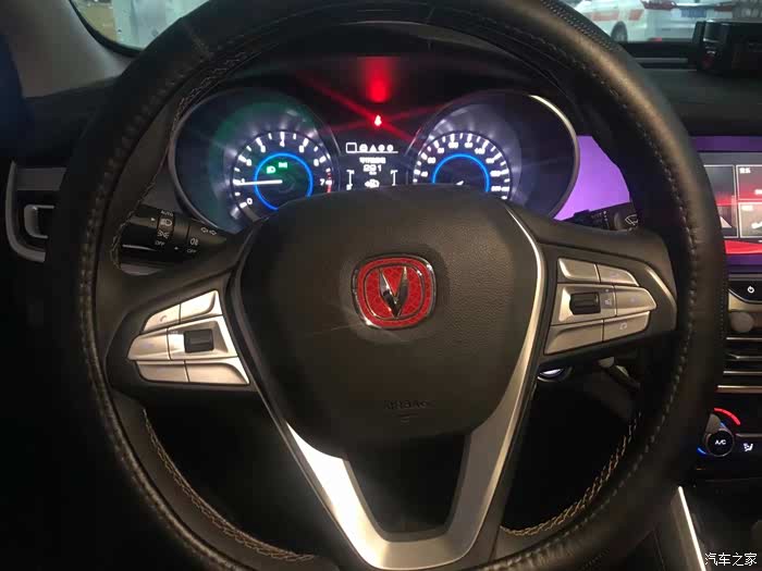 再看看D型的多功能方向盘,炮筒式的仪表盘。很有威慑力,方向盘的功能也很丰富,有接打电话,语音控制、音乐播放和调节。功能丰富