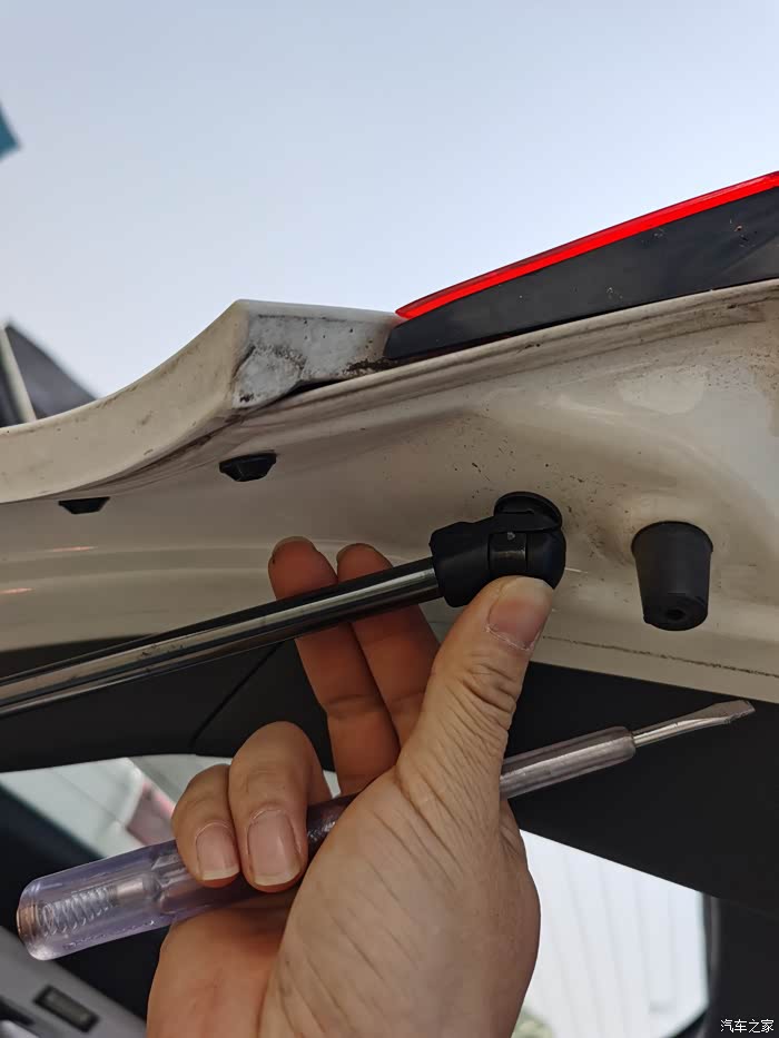 另一端的卡扣同理,用平口螺丝刀往外撬,撬卡扣时,可以不用把卡扣完全撬下来,也能取出支撑杆