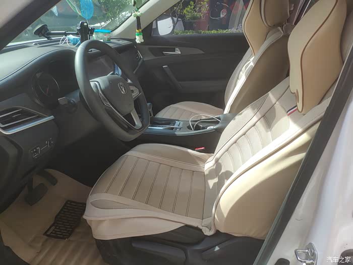 原来用着一套黑色的座套和脚垫,当时买的时候也不知道那根筋不对了(想了想可能是感觉车内饰是黑色的,再买个黑色的与原车内饰搭配一下吧),买了个黑色的呢,黑色主要是不耐脏啊,一点土就能看出来,让人感觉非常不舒服,所以这次吸取教训了,选择了一个米色的,米色的相对来,还比较耐脏,也耐看。长安CS35PLUS是原车的座椅是真皮的,这个比较厚道,比起一些合资的品牌来说,竟然还用帆布的。虽然是真皮的,但是总想弄个座套来保护一下,其实呢这一点也不错,心理也纠结,有真皮的不坐,弄个座套,当要换车的时候还没老着正儿八经的坐坐真皮座椅来,所以说很纠结。
