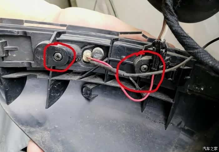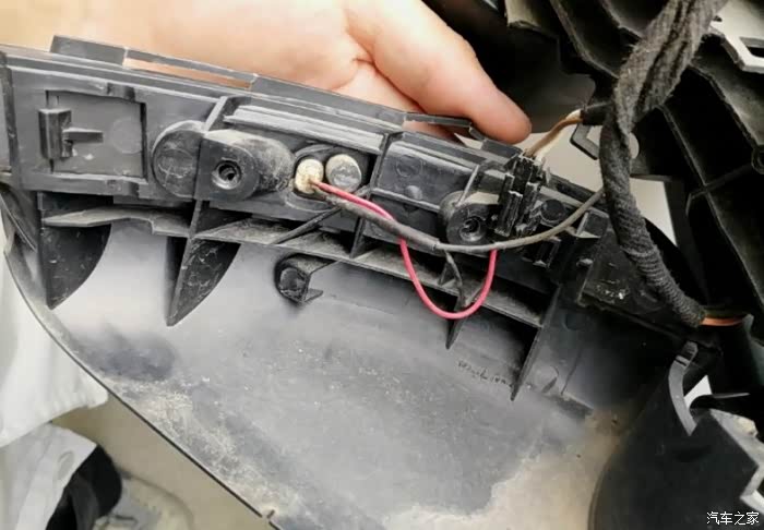 接下来就是这个接线了,转向灯是2根线(一红一黑),实际上原车还有一根黑线是后视镜加热的,是跟转向灯的黑线接在一块儿,所以这里可以直接把原来的转向黑线剪掉。