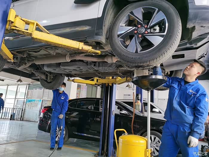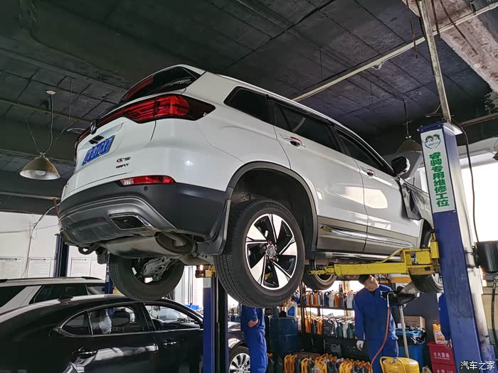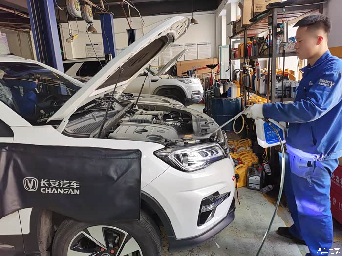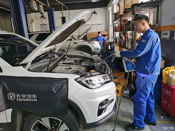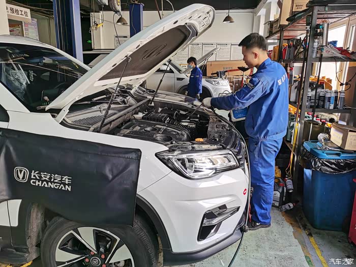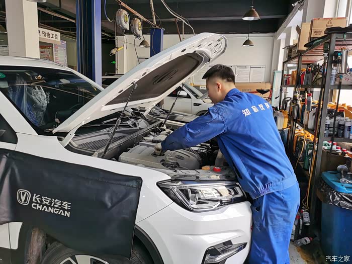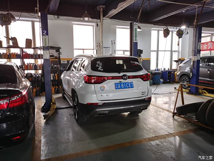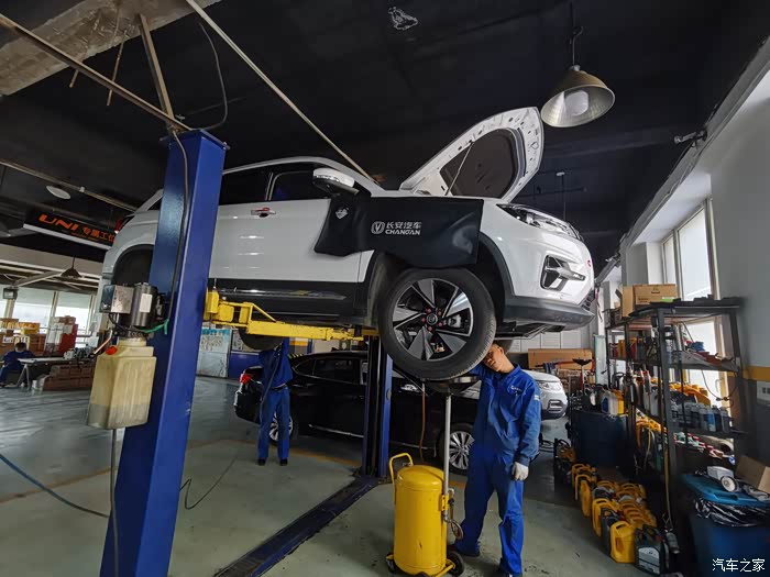 举升机把大七升到半空,长安的师傅们开始做基础检查。