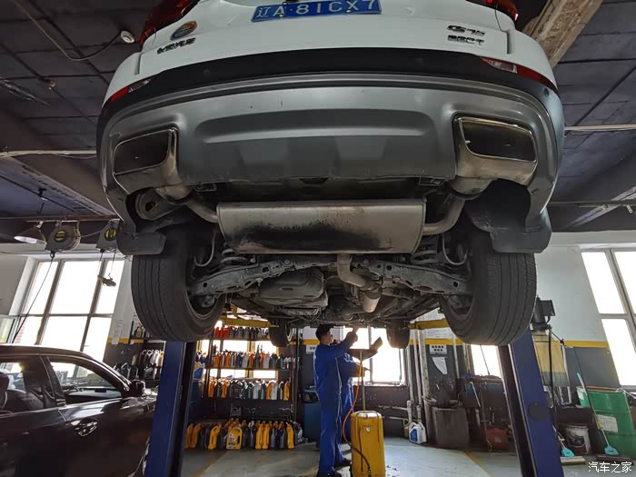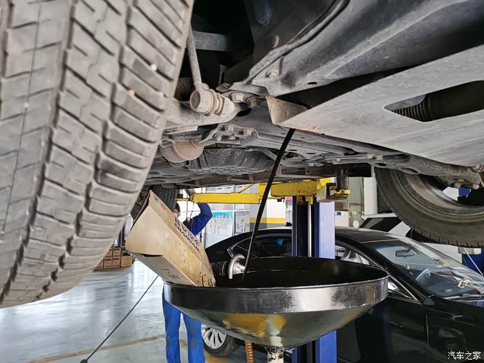 两个人配合,一个人检查底盘,一个人开始放掉旧机油。