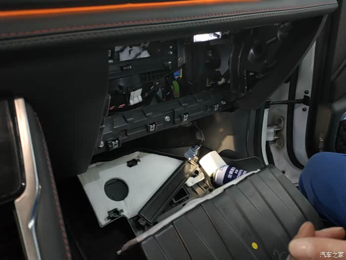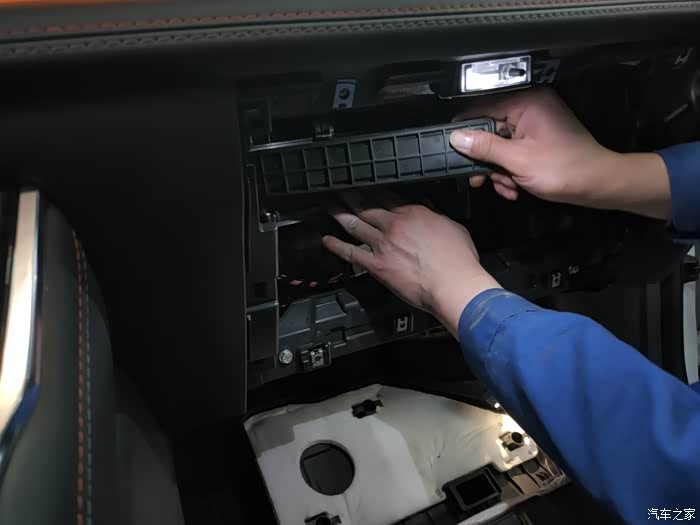正常拆卸手套箱需要拧下好多螺丝,然后可以看见空调滤的位置,拿掉盖板,里面就是空调滤