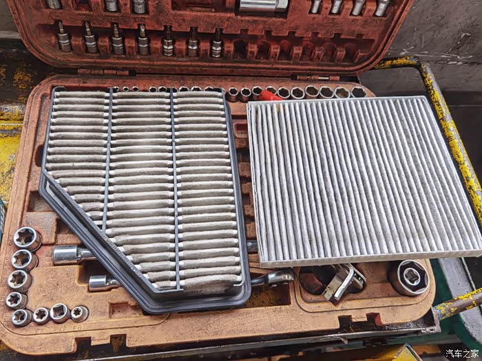 这是拆卸下来的空气滤芯和空调滤芯。还不是很脏