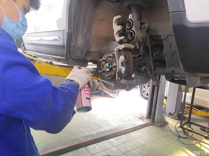 保养正式开始了,师傅首先选择的是保养刹车系统,图上为正在拆卸轮胎之中。