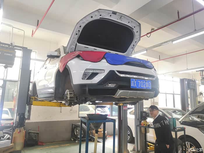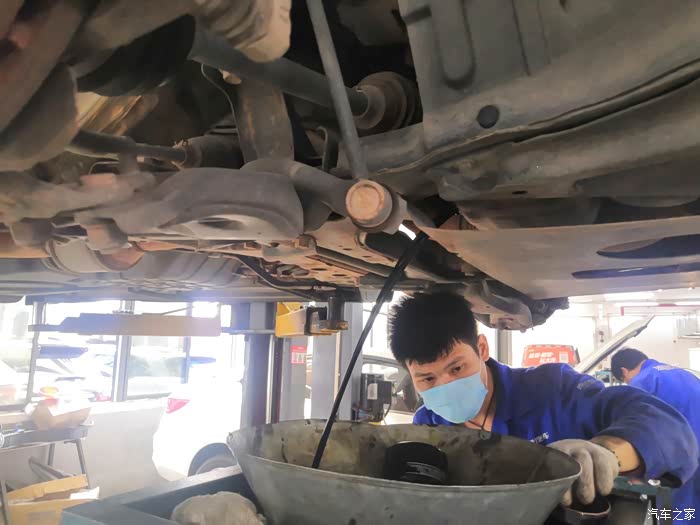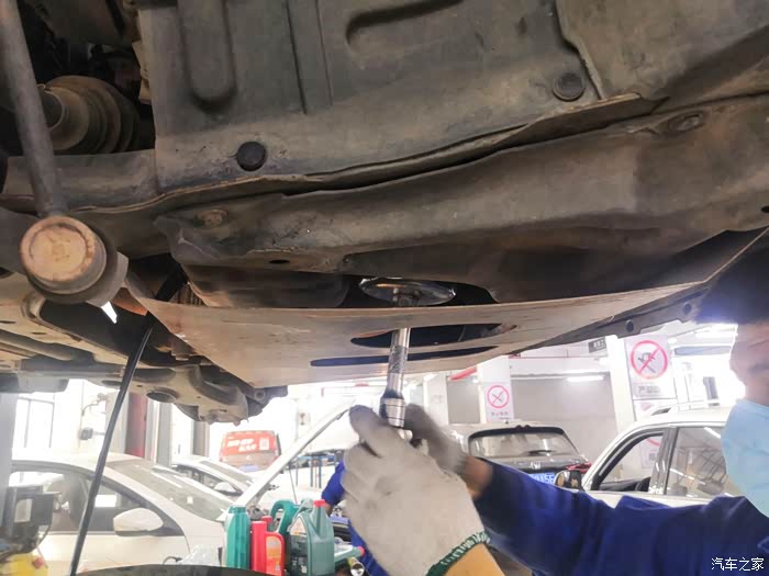 轮胎养护已经做完,小七也被升得高高的,更换机油开始了。