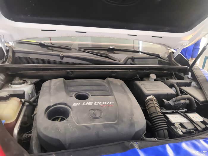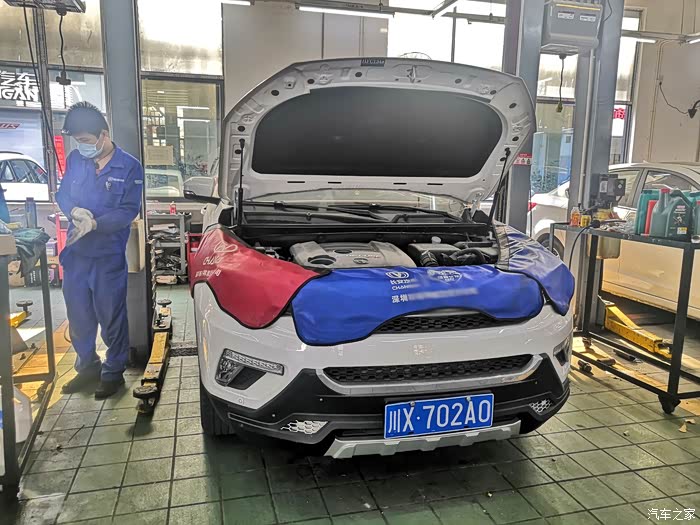 由于是预约的保养,所以很快便进入保养车间了。维修师傅正在做保养前的准备工作,我们可以看到小七的车头已经铺上了防护垫,防止弄脏车身,特别的细心。