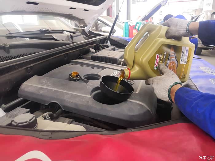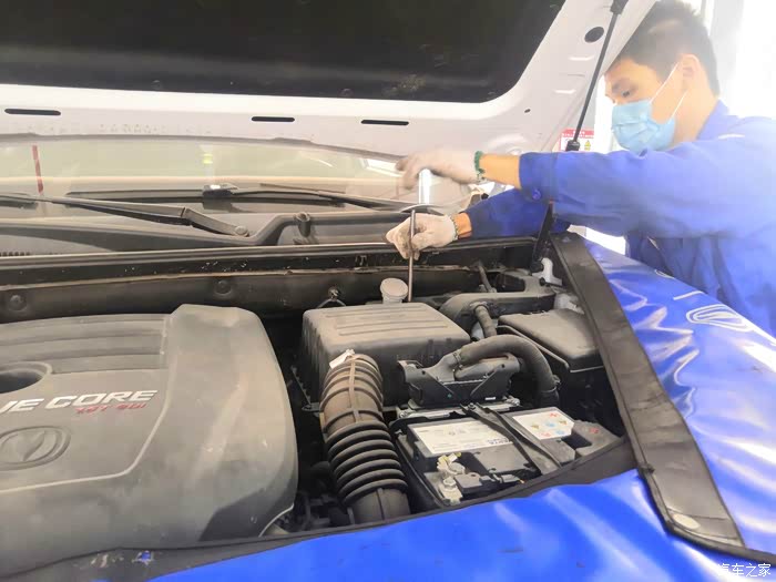 机油加注中,加精油也有一个度,不能太多,也不能太少。加到一定程度之后,师傅就会用机油尺测量一下它的刻度,看是否合适,工作还是很负责任的。