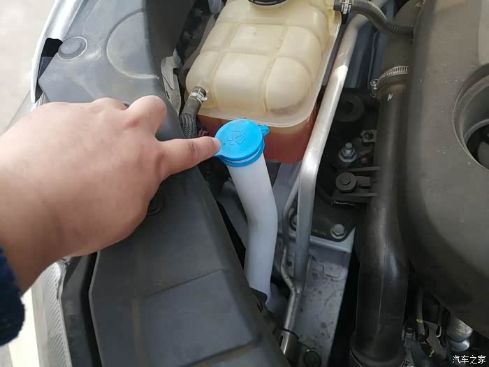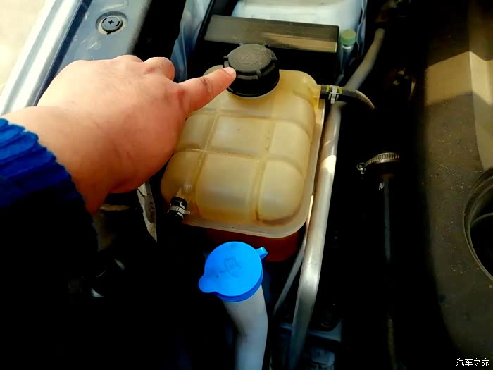 这是车的防冻液加注口,平时观察防冻液罐上面的刻度线,如果低于最低刻度线表示该添加防冻液了,添加防冻液一定要选择相同型号和颜色的。
