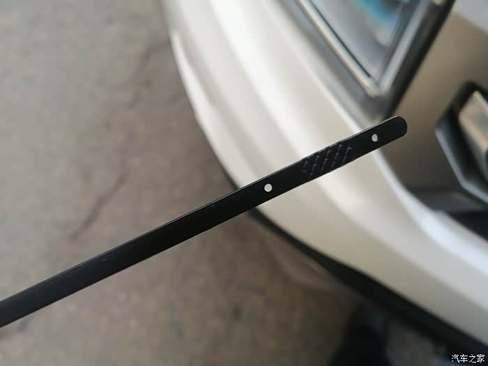 机油卡尺拽出来的样子,仔细看两个圆孔直接有灵性刻度线,机油在两孔之间的位置说明机油量正好,超过或者少于圆孔位置都是不对的。