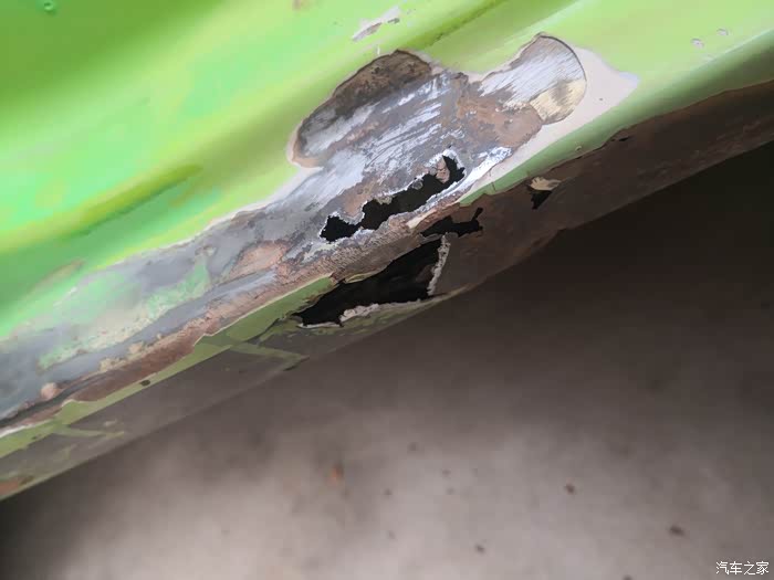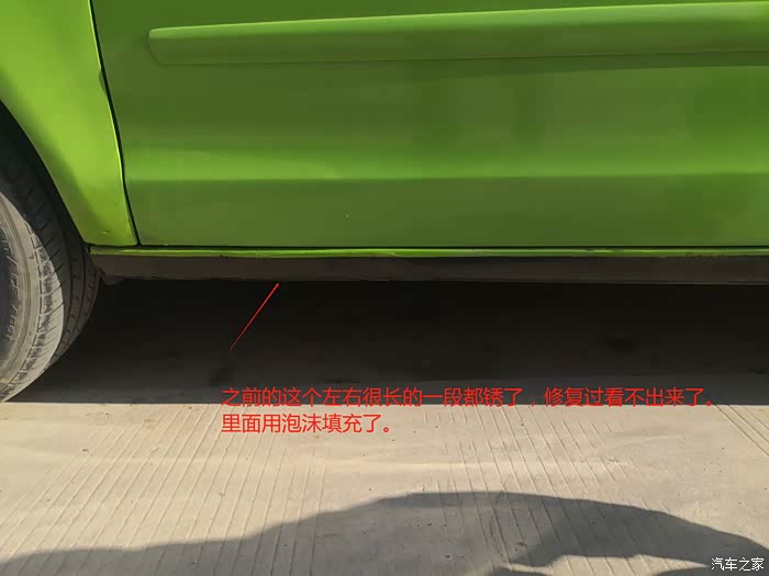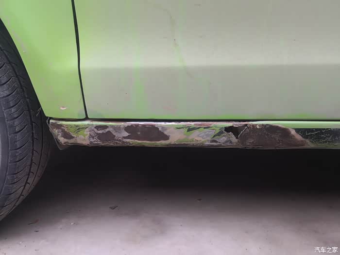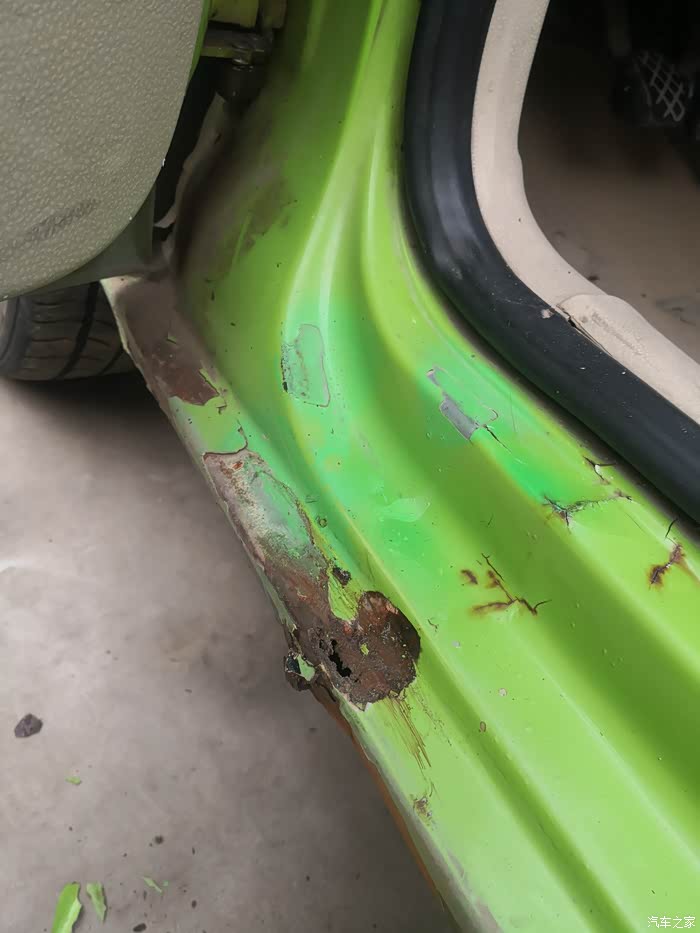 主驾门处的侧裙。去掉起鼓的漆面后,惨不忍睹。