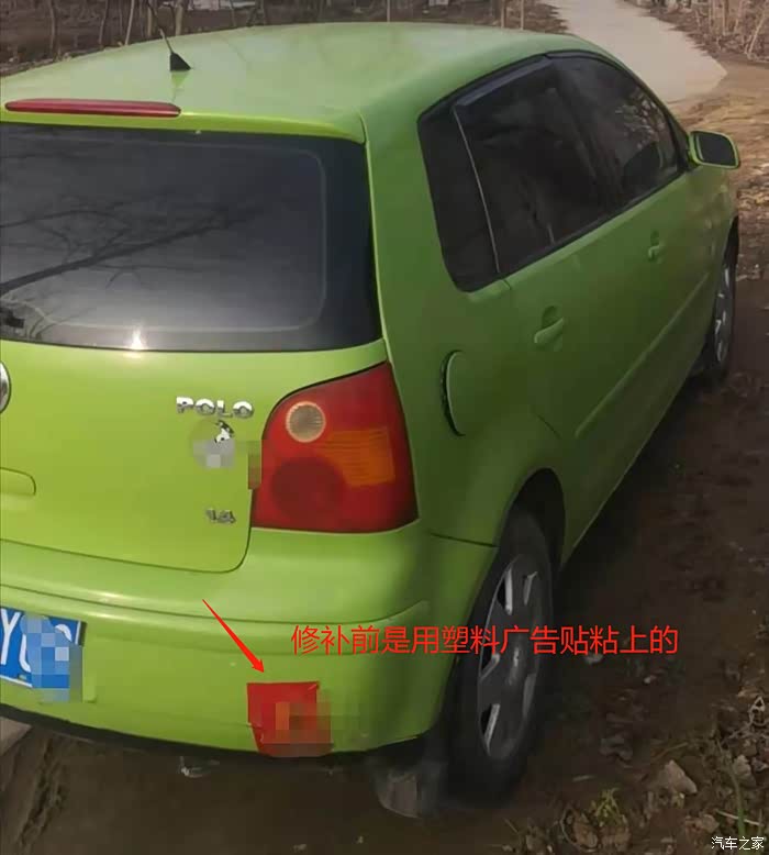 后保险杠有个大裂缝,之前被扎丝扎上,表面贴了这个红色广告贴。用钳子和螺丝刀进行校正,尽量整理平整。然后再用热熔胶给粘死。后用打磨机尽量打磨平整。最后统一刮腻子、打磨、再刮腻子、再打磨,反复三遍再喷漆。砂纸由粗到细,依使用。