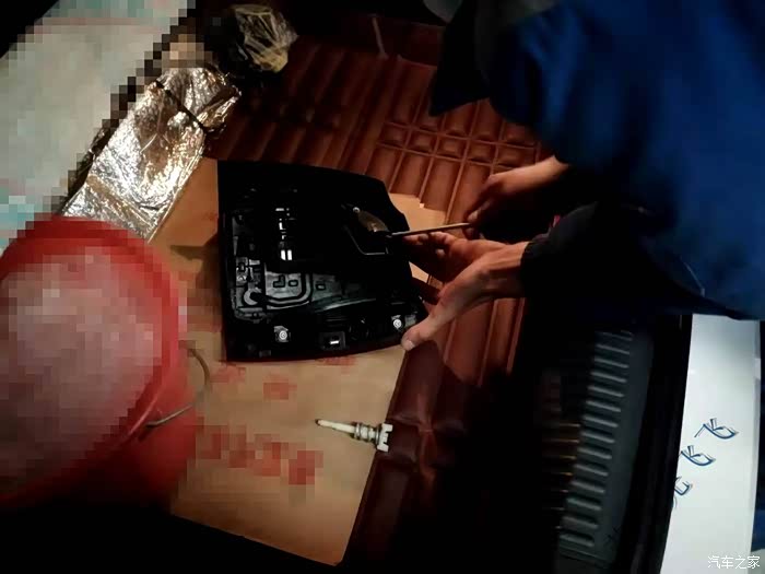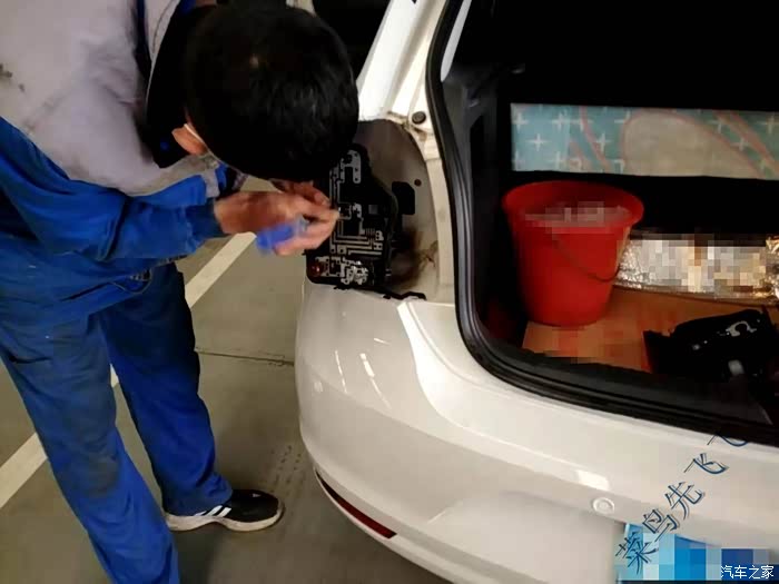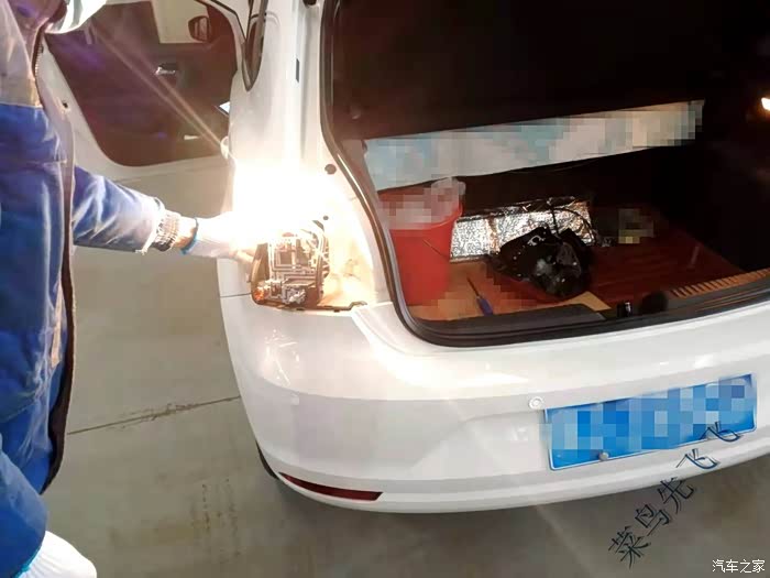 停在工位上打开大灯开关发现依然不亮,于是师傅就开始拆卸尾灯罩进行检查,尾灯的拆卸还是比较简单的,扒开尾灯后面的毛毡有一个塑料螺栓,拧下来后灯壳就能拿下来了,然后底座和灯壳是卡扣固定,小心打开卡扣就能看到安装灯泡的底座了