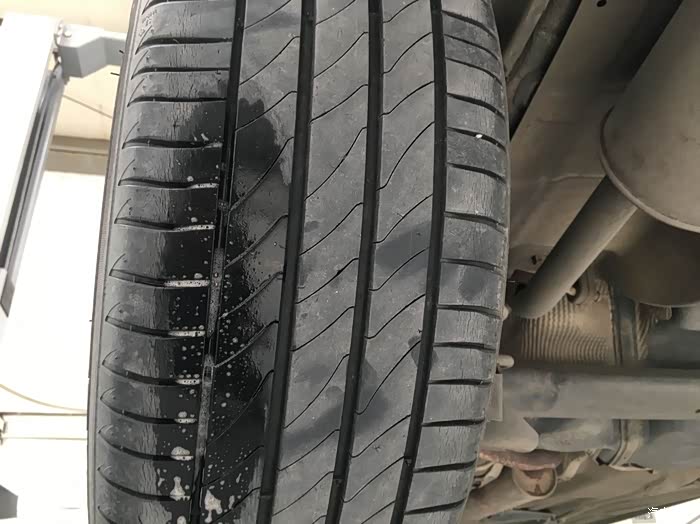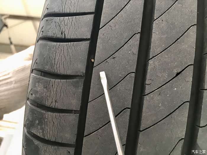 我再仔细检查轮胎正面是否有扎钉子,发现左后轮胎纹凹陷处有一个钉子。先把钉子拔出来,然后用肥皂水测试是否漏气。